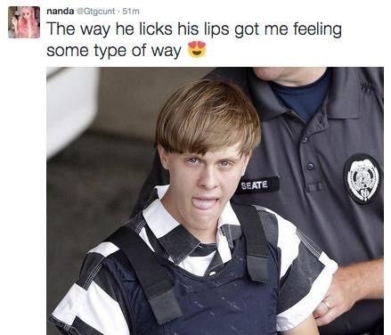 I know there's another Charleston shooting thread going on but I saw this on one of my social media accounts that one of my former co workers was calling the suspect cute and talking about how he licks his lips! I hate commenting and stuff like that...