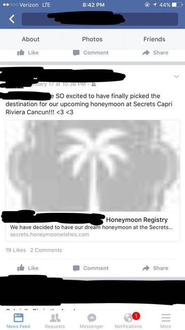So my friend posted this about their upcoming wedding. They are have been dating 2 months, wedding is in April and 10-20 guest max. This popped up in my news feed. The description says ..." We have decided to have our dream honeymoon at the Secrets...