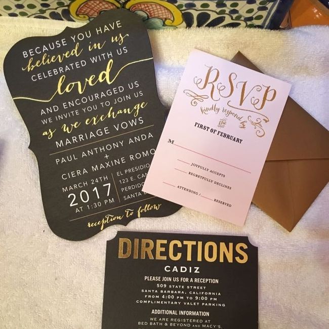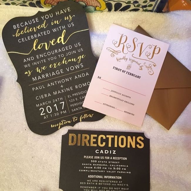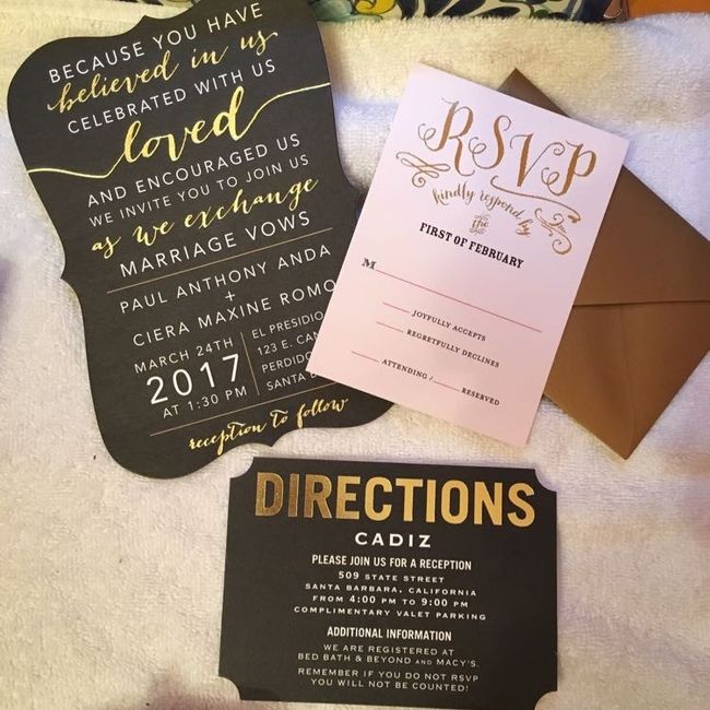 Let's see those invitations! Also I have a question, I still have my ex's last name, would it be bad if I used my maiden name on the invitations and save the dates? I just don't want anything with my current last name with this wedding. I know it...