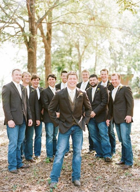 Went to a tuxedo rental place today and they rent suits. My fiance will not wear a tux he wants to wear jeans so we settled and he has to wear a suit jacket vest and tie. We went with tan its a country wedding, i don't know if i should put the...