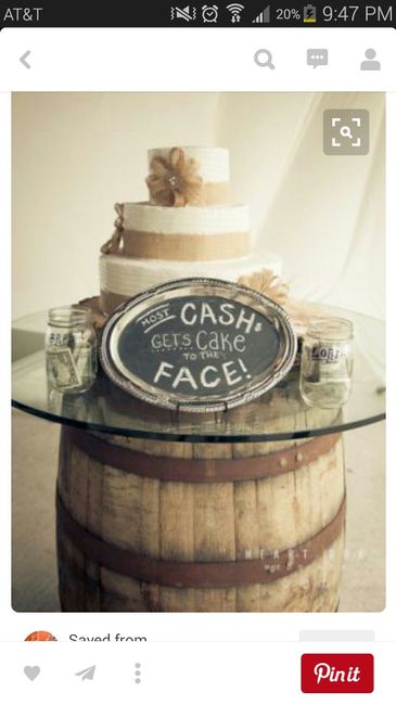 Since we love to observe others bad etiquette from afar I have to share this pin I JUST saw. Apparently there's 2 jars, one says bride one says groom. Guests stick money in them and whoever has more money gets cake in the face. Right up there with...