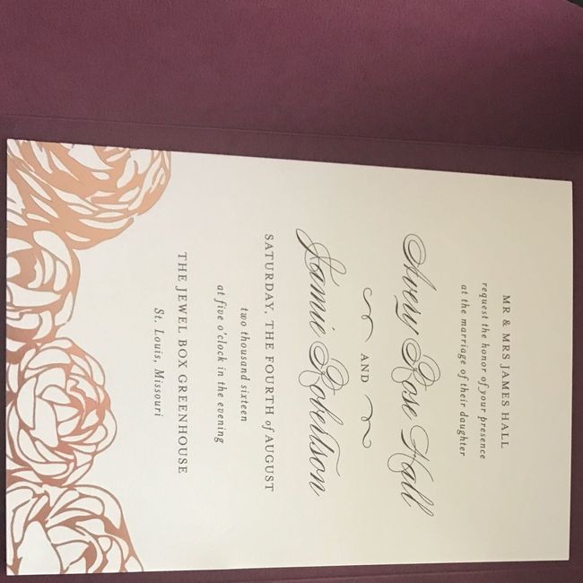 Hi all, After a long road of trying to find the perfect wedding invitation and even trying the custom route (way more than I wanted to pay for 15 invites) I finally found a very pretty invitation from Minted! Even FH likes the look- he's a man of few...