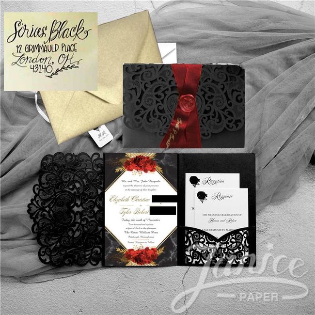 I can not decide on what type of laser cut pockets to get to go with my invitations. Both pocket choices come in each color. Having a really hard time with this step! Also what vibe would you get from my invitations? Formal? Thanks everyone! This...