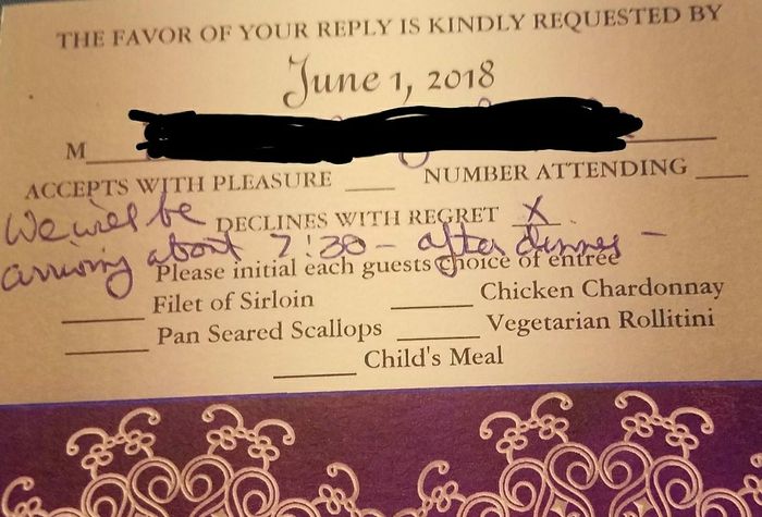 *smdh* Today we got an RSVP from on of my FHs uncles..they marked the "regretfully decline" box....THEN they wrote over half the RSVP with a note that says "We will arrive about 730pm - after dinner" WTF?! You aren't coming? You are...