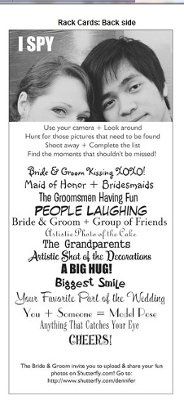 I'm working on my I spy cards, before I submit my Vistaprint order & would love to see what you ladies have done with yours .. Thanks in Advance I also have accounts with both winkflash & wedding turtle, stuck on what one to use..