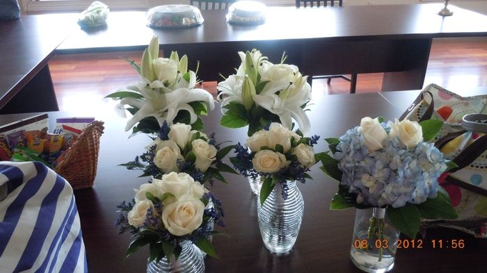 So my bouquet is going to be hydrangeas, oriental lillies and delphinum. The florist is just doing hydrangeas and delphiniums for the bridesmaids and suggested just using plain white roses for the mother's corsages and men's boutineers since the...