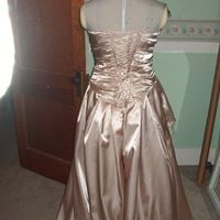 5248 days agoHere is my dress as it looks right now. The trims and finishing details are still pinned, so excuse me for that. But it's getting closer and I like it more everyday--my question is this. You can see how the back makes a nice V shape on the dress...