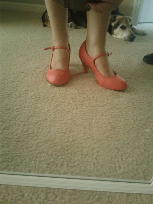I have my dress!! Just picked it up from David's bridal this week. Now I'm thinking about shoes...I want something with some heel for sure. My fiance is over 6' tall. Can't decide if I want color or not! Our colors are coral/peach, light blue, and...