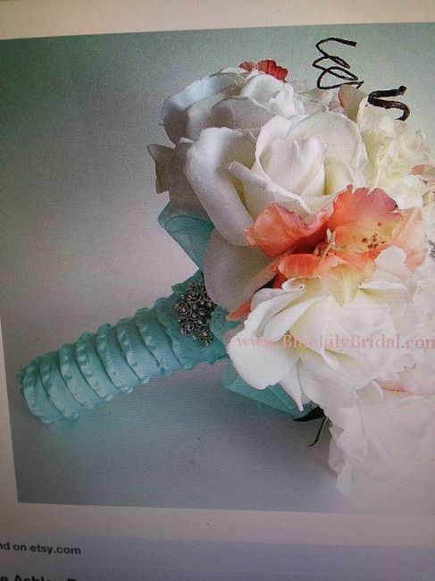 Just wanted to share - our colors are coral, beige and white with hints of turquoise. I'm doing mostly roses in shades of coral, blush, peach and white/ivory. I'm in love with this bouquet. My will be similar only with varying sizes of roses. And...