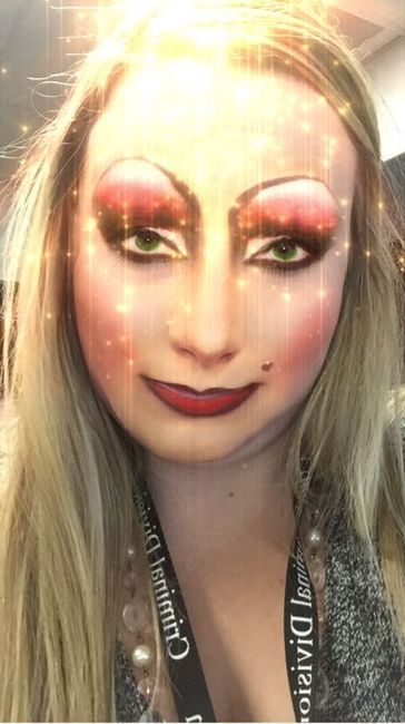 Holy shit. This make up is so awful there are no words. I am having a girls night out and thought I would treat myself to some pampering. Holy crap. There are no words. I look like a bad drag queen. First me with no make up.