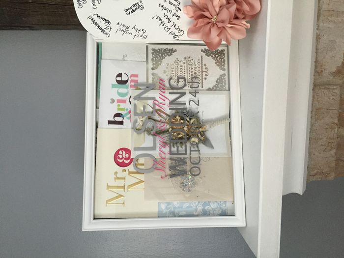 A year and a half ago, I gave my FH a plain wooden shadow box and asked him to cut a card slot into it for the wedding. I even mentioned it here on WW. Welp...after a loooong wait, I am happy to say that I can finally show it to you all!! FH spent...