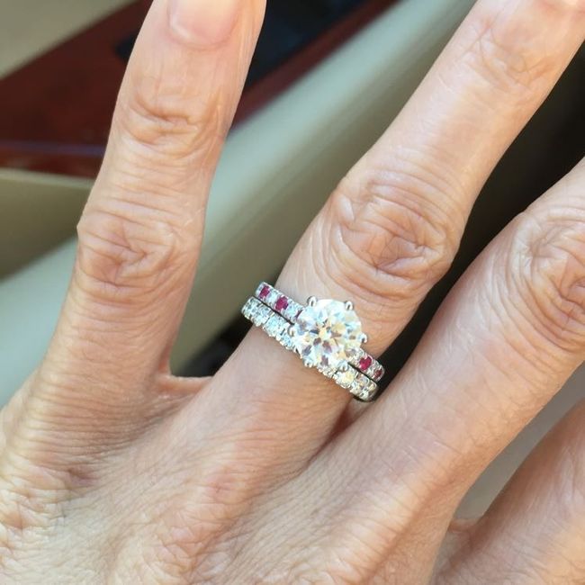 So my FH proposed with a beautiful 3/4 ct princess cut solitaire. It has a plain white gold band that's slim. I'm trying to decide what looks good next to it for a wedding band. I don't want a plain band I'd like my wedding band to have some sparkle...