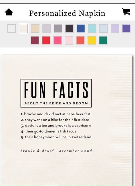 Wedding paper divas has 40% off personalized napkins and I wanted to order some with fun facts on them. I thought it was a fun, personalized touch. I need help brainstorming what kind of facts we should use! Anyone do something similar or have any...