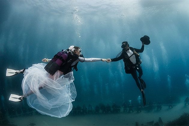 I'm trying to figure out if I should wear a wedding dress for my underwater wedding OR a wetsuit and tutu. Any advice on underwater attire?