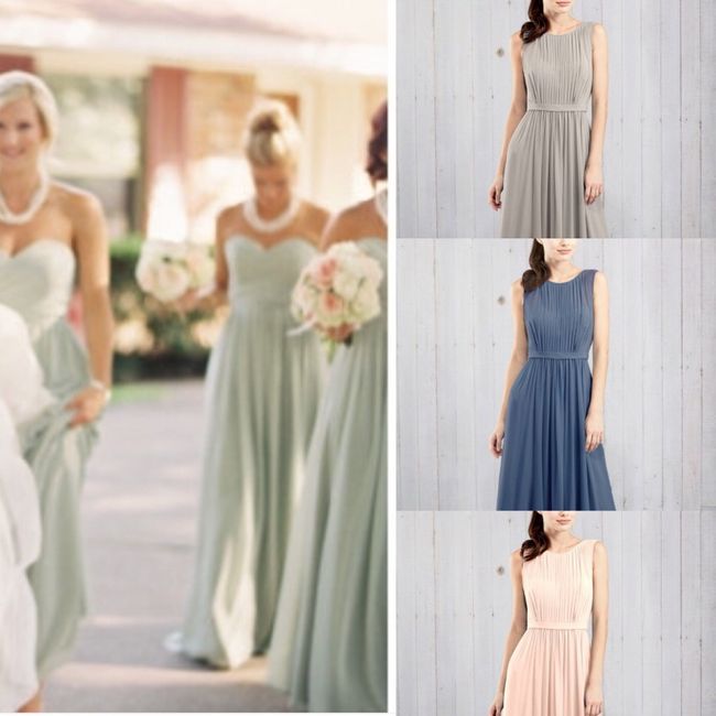 My bridesmaids are wearing a pistachio color and my flowers will have peach, blush, greens, white. I originally wanted my mom to wear champagne but she thinks it's too close to the color of my wedding dress and wants to wear a color. I can't figure...