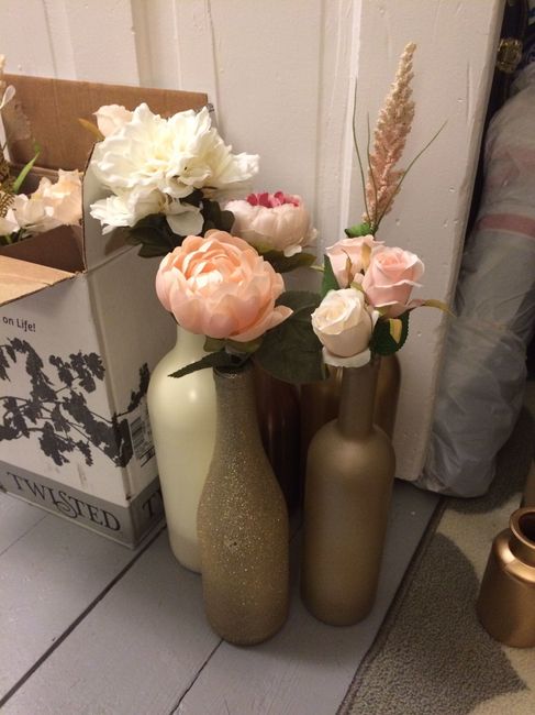I'm making my centerpieces and looking for some feedback... I know these photos are not the best, but you get the idea. My future in laws spray painted the bottles for me, I bought and arranged the faux flowers (I'm allergic to real and hate the...