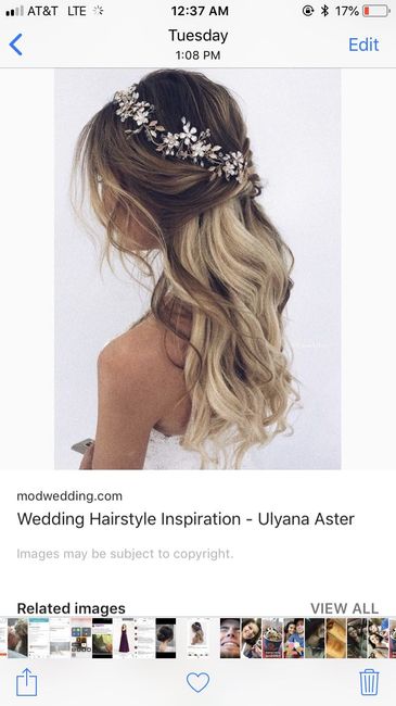 Hello, I’m not 100% sure how I want my hair for my wedding. I know I want it half up half down, but other than that I’m stumped. I have bangs (full not side) and I’ll be wearing a veil and a silver headband. Does anyone have any suggestions for a...