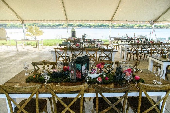 Hello. I need ideas for my centerpieces. We have eleven 10 ft long farmhouse tables, we plan to put lanterns in the center of the table with a gold terrarium next to that with the table #s. But I need ideas for the of the table since their so long. I...