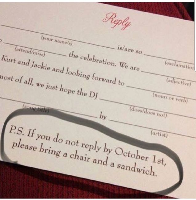 Saw this on Pinterest and thought it was funny, so I figured I would share😊 Getting ready to send out our invites and crossing my fingers we don’t have much trouble with our family and friends send back their RSVP’s!