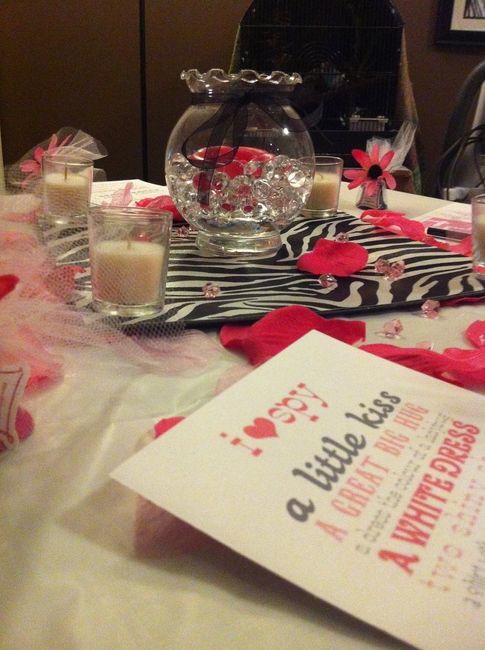 What do you ladies think? This is for a six to ten person table. (Pictured: Zebra Charger Plate $1.50, Ivy Crimp Bowl $.94, Water Beads, Kissing Bells Favor, Ispy/Crossword, Petals, and Pink Ice)