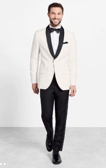 What will your groom and the guys be wearing?? This is our inspiration...adding some gold yo the groomsmen but my groom and our son will definitely be wearing the white with black touches on the jacket and black pants.