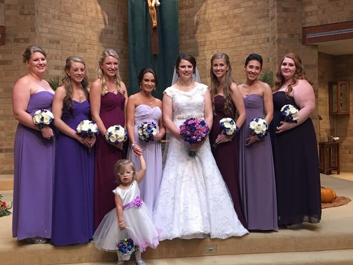 I am a very low maintenance bride and I would like my bridesmaids to be able to choose a dress color and cut that they like best on them, but I also want to make sure the colors go well together. The colors I'm going with are going to be purple,...
