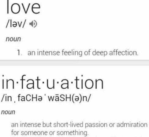 According to P.S. I Love You "When infatuated with someone, you become lost in the emotion of a toxic desire.....Love is a strong feeling of intense affection. With true love, you are faithful, confident, loyal, and you are willing to make sacrifices...