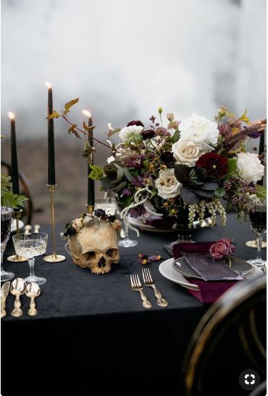 My fiancé and I have decided to go with a Victorian Goth aesthetic for our wedding in October. Our main wedding colours are black and silver, but we’re considering adding a touch of deep plum as an accent. We’re thrifting candelabras to paint black...
