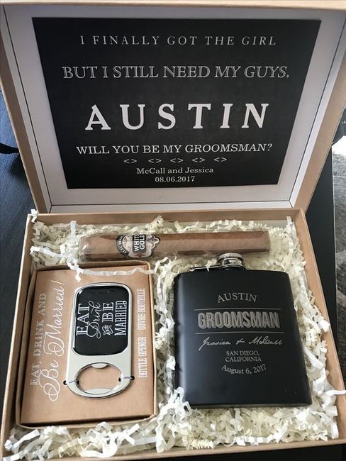 I want to propose to our groomsmen in a nice way and want to make them a proposal box like I’m doing for the bridesmaids..can anyone give me ideas of things to put in it? Post your pictures!