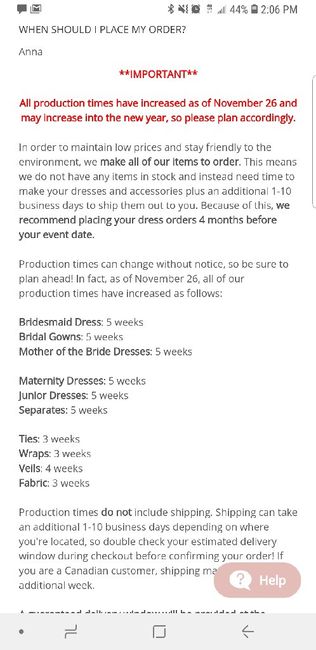 Hi Ladies! Just wanted to share with all who will be using Azazie (or plan to) that as of November 26th, their production lead time has increased from 3 to 5 weeks.