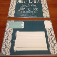 4218 days agoJust received our Save the Dates after ordering my dress this wekend. The dress has gorgeous lace cap sleeves that echo the lace in the design. I got digital files customized from an Etsy seller for $12. Then I took advantage of a 33% off sale...