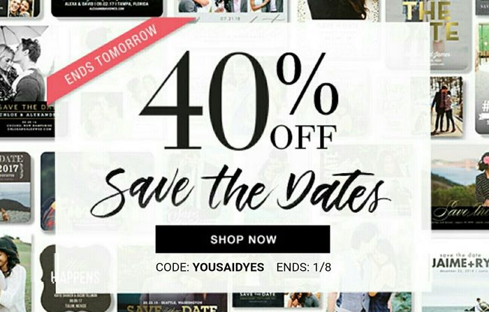 Today only use coupon code "YOUSAIDYES" for 40% off Save The Dates on Wedding Paper Divas website. Happy shopping!