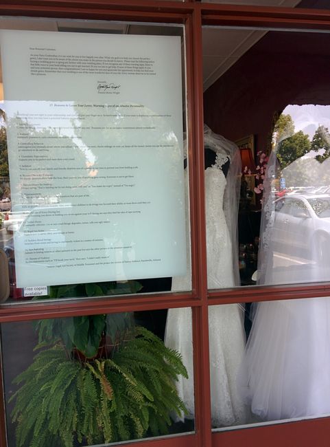We are still thinking of you. I went by the bridal shop and took a photo of the letter I told you about in your post. Hope you're well and safe! Leaving this here for anyone in a similar situation and not sure how to get out.