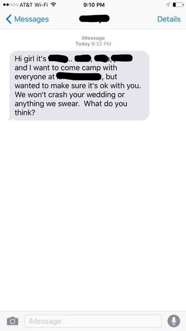 90% of our guests are coming from out of state and many of them are avid campers with nice RVs and have opted to stay at a local RV resort instead of a hotel. I got this text message from a friend who is not invited to the wedding (not because I...