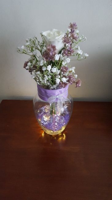 Beginning stages of making my DIY centerpieces. Our colors are purple and grey. I'm thinking about using cool water roses (light purple color) instead of the white, but this is what I found to do the mock up. I knew I wanted to use lights in the...