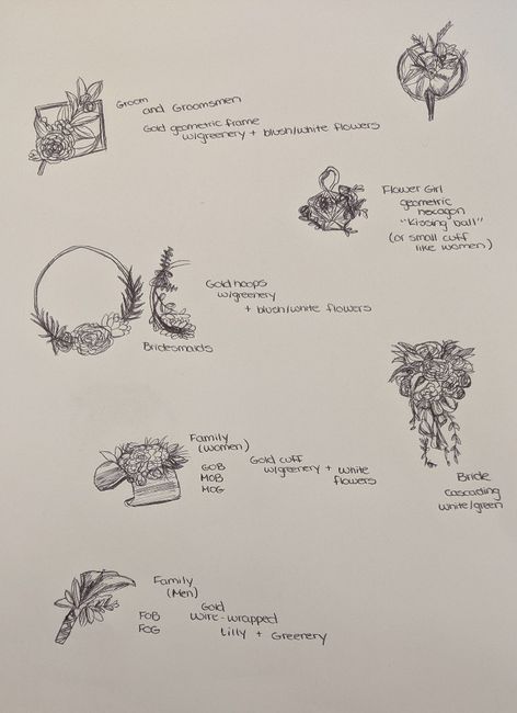 I'll be DIYing some of my florals (tables and venue will be covered by a florist). Here's some of my sketches- the theme is gold and green geometric/modern.
