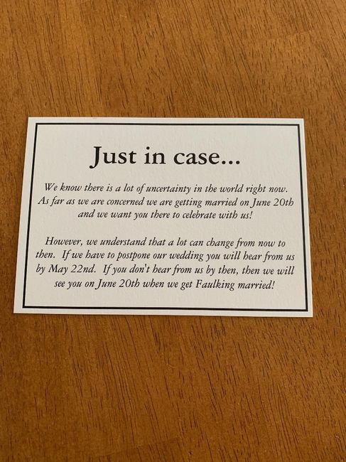 My fiance and I are supposed to get married June 20th, and we are freaking out we will have to Postpone!! We are just not ready to pull the trigger on that yet, so we sent out our invitations with these inserts inside. I want to know from all you...