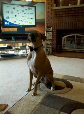 I was out shopping today and found this bow tie for our boxer ! He is going to wear it for our engagement photos in October.