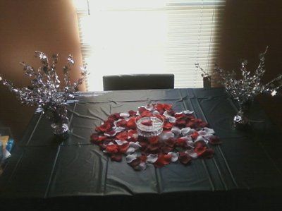 Ok so I set up on my kitchen table a miniature of what the tables will look like for the wedding....The bowl in the middle will be different but this is very close to what the 5ft long tables will be set. The rose petals will be strewn down the...