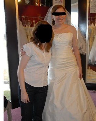 I couldn't resist--here's my dress! It's an ivory drop-waist by Alec Milano (sooo annoying that you can't find any pics of his dresses ANYWHERE). I'm with my sister (sorry for the blot-outs of faces!), and wearing my mom's veil. Its hard to see...