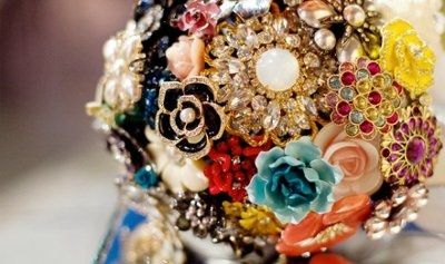 here is a mock up of one of the reception tables. We finished decorating our cupcake tree and my brooch bouquet is coming along well!