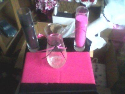 Sand, Rose, Candle or Cross? . I am doing sand! Black & Fushcia! And we're using our Hurrican Glasses from Hard Rock Cafe Gatlinburg as our pouring glasses and we're using an 1800 Tequila bottle as our vase. I am going to take the vase to Things...