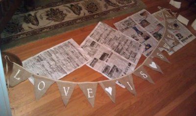 My cousin and I got together this weekend to tackle some DIY wedding projects --- made 18 burlap table runners, used chalkboard paint on a bunch of gold mismatched picture frames, and made this awesome banner for the dessert table. Love love love...