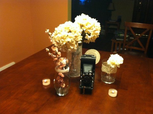 I admit, I don't post very often, but with only 102 days to go I couldn't help myself from sharing some details! 1. Ballroom 2. DIY vases (hot glued lace onto glass vases from Dollar Tree) 3. Centerpiece mock-up (short vase will have 3 carnations,...