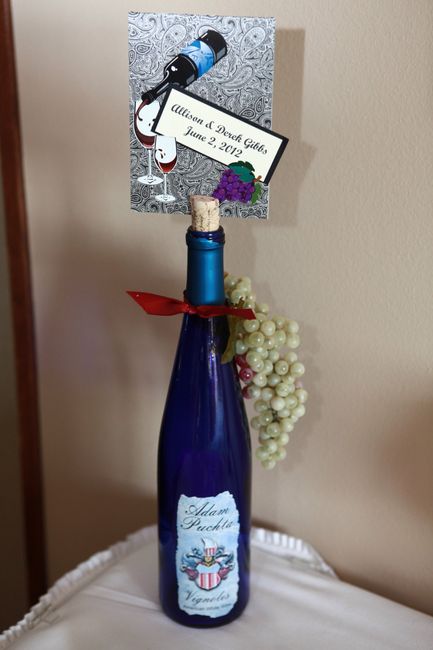 what we are doing for our center pieces is that we are taking empty wine bottles and putting the name of the missouri wine grapes Cayuga white, Chardonel, Seyval blanc, Traminette, Vidal blanc, Vignoles, Catawba, Chambourcin, Concord, Norton /...
