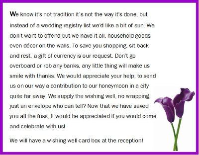 Hello everyone! I wanted to share with you our wedding wishing well poem cards that i sent to my family and friends asking for money instead of gifts. We dont need toasters and dishes as we have been living together for some time so instead we asked...