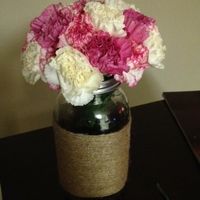 5003 days agoHey ladies! So I went to Publix and got a bunch of carnations (not in my wedding colors, I'll be using purples!) and tried it out on my mason jars! Each table (rectangular) will have the big twine jar in the middle, the lace candle votives, and then...
