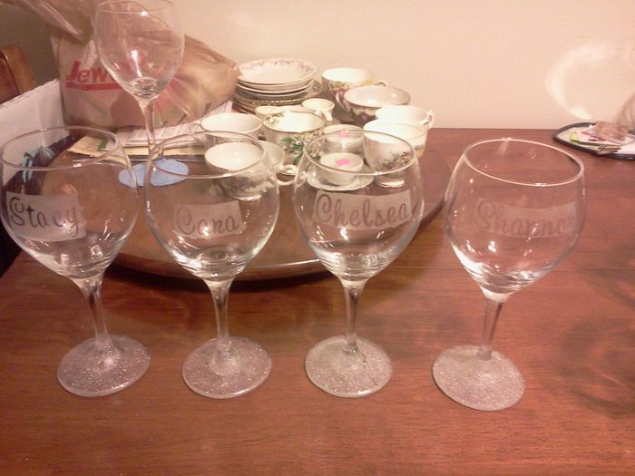 So I'm really really proud of them. I bought them at the dollar tree, etched them myself, and glittered the bottom of the girls glasses myself. Something that would have cost me around $250 to get each individually cost me about $25. What do you...