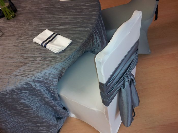 I'm doing blingy napkin holders, I bought a roll of rhinestone mesh and I am glueing it to a navy blue ribbon (my colors are navy blue, silver, and ivory). An example of the desired look (on the table setting) is attached, plus a pic of my DIY. The...