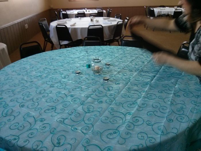 Okay got my sample linens in today. Went to the banquet hall and layed them out. We decided on Black table clothes and White chair covers with the turquoise overlay and sash. We have some different choices as to the napkins. So I want your opinion on...